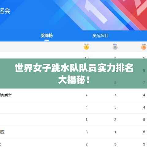 世界女子跳水队队员的排名是根据她们在国际比赛中的表现、技术水平和难度系数等因素综合评定的,中国女子跳水队在世界上处于领先地位,其他国家和地区的选手也在不断进步,这些优秀的选手在背后付出了巨大的努力和汗水,她们的精神值得我们学习和敬佩,我们期待更多优秀的女子跳水选手在国际赛场上展现自己的才华,为国家的荣誉而努力拼搏。